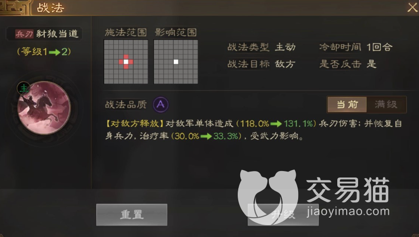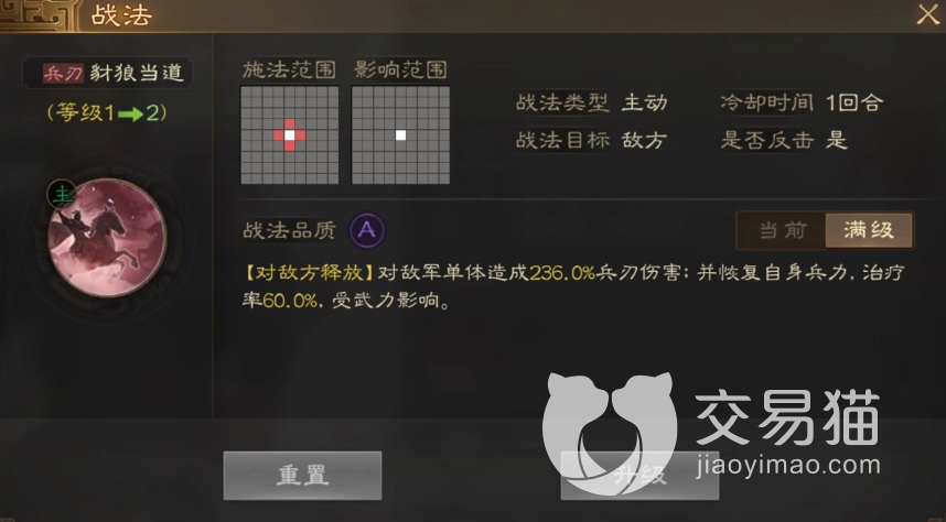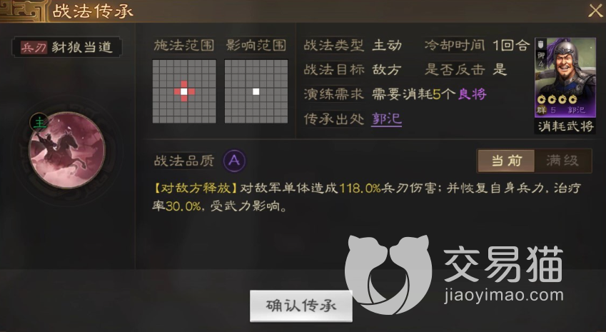 这是一个A级战法,是武将郭汜的战法,这个战法属于一个兵刃战法,施法的范围是一个小范围,影响的范围也是非常小的,在使用之后大家就可以在上面对敌军带来236%的兵刃伤害,带来高倍伤害的同时,大家还可以在上面恢复自己的兵力。