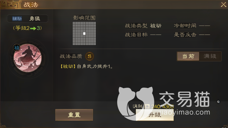 由于其极高的御值需求量,因此该武将卡牌是无法上阵的,也就是说,是一张真纪念卡牌,战法也无法传承,因此,该武将除了纪念价值以外,就没有其他的用途了。
