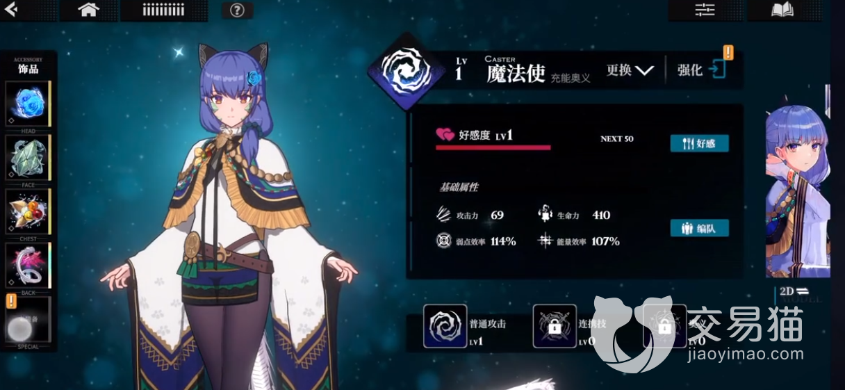 初始属性数据是:攻击力69、生命力410、弱点效率114%、能量效率107%。攻击力面板白值稍比其他魔女角色来说较为低,不过玩家通过练级以及送礼物提升好感度,可以增强角色的基础属性。