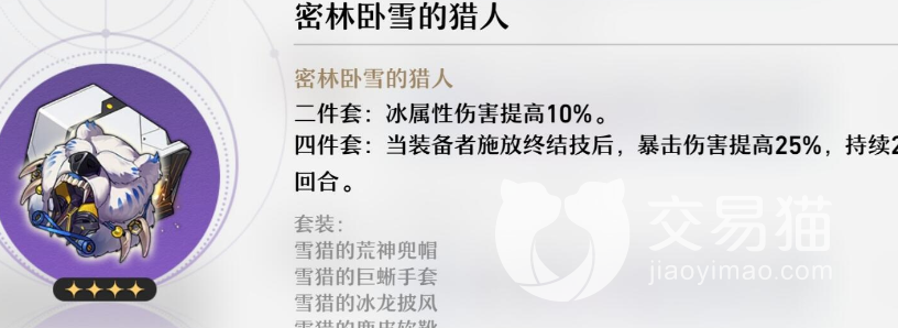 当着四件装备集齐之后就可以获得密林卧雪的猎人的套装效果了,套装效果分为两档第一档可以提高穿戴者百分之10的冰属性伤害,第二档则可以让穿戴者在释放了终结技之后获得一个百分之25的爆伤加成,这两个效果对于冰属性的输出角色来说非常的有用。