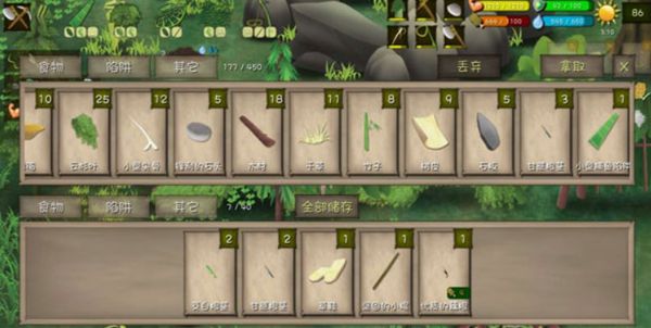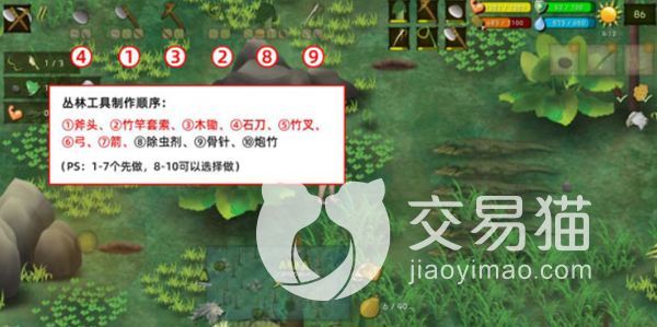 而之所以先做斧头,是因为在这个地图中会有很多的树木挡住道路,妨碍行走,先做斧头的话,就可以开辟道路了,而套索的主要作用,就是在该地图中会有很多的藤蔓,做了套索大家就能获取到大量的藤蔓了。木锄和石刀的作用主要是开垦荒地种植粮食,而竹叉,弓和箭则是用来打猎的,这些东西都是保证角色能够在这片荒野中活下去的基础材料,所以一定要去制作一下。