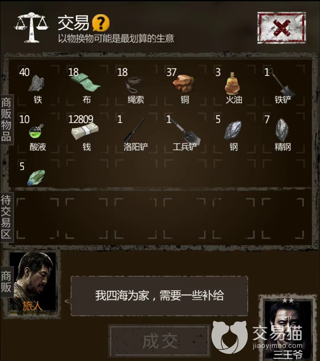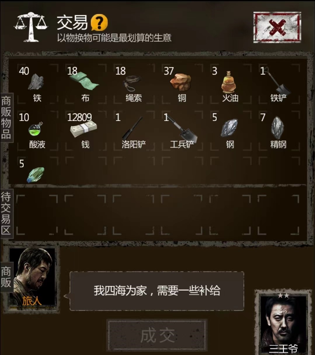 怎么样才能和旅人达成交易。如果说“这笔生意真是让我印象深刻啊”那就说明玩家选择的物资价值超了,可以适当取回。如果说“你真大方”那么可以继续取回。“这笔生意很公道”那就说明价值超不多了。“你真吝啬”那么就说明玩家选择的物资价值在能不能交易的价值范围的临界点了,玩家们可以自行选择。