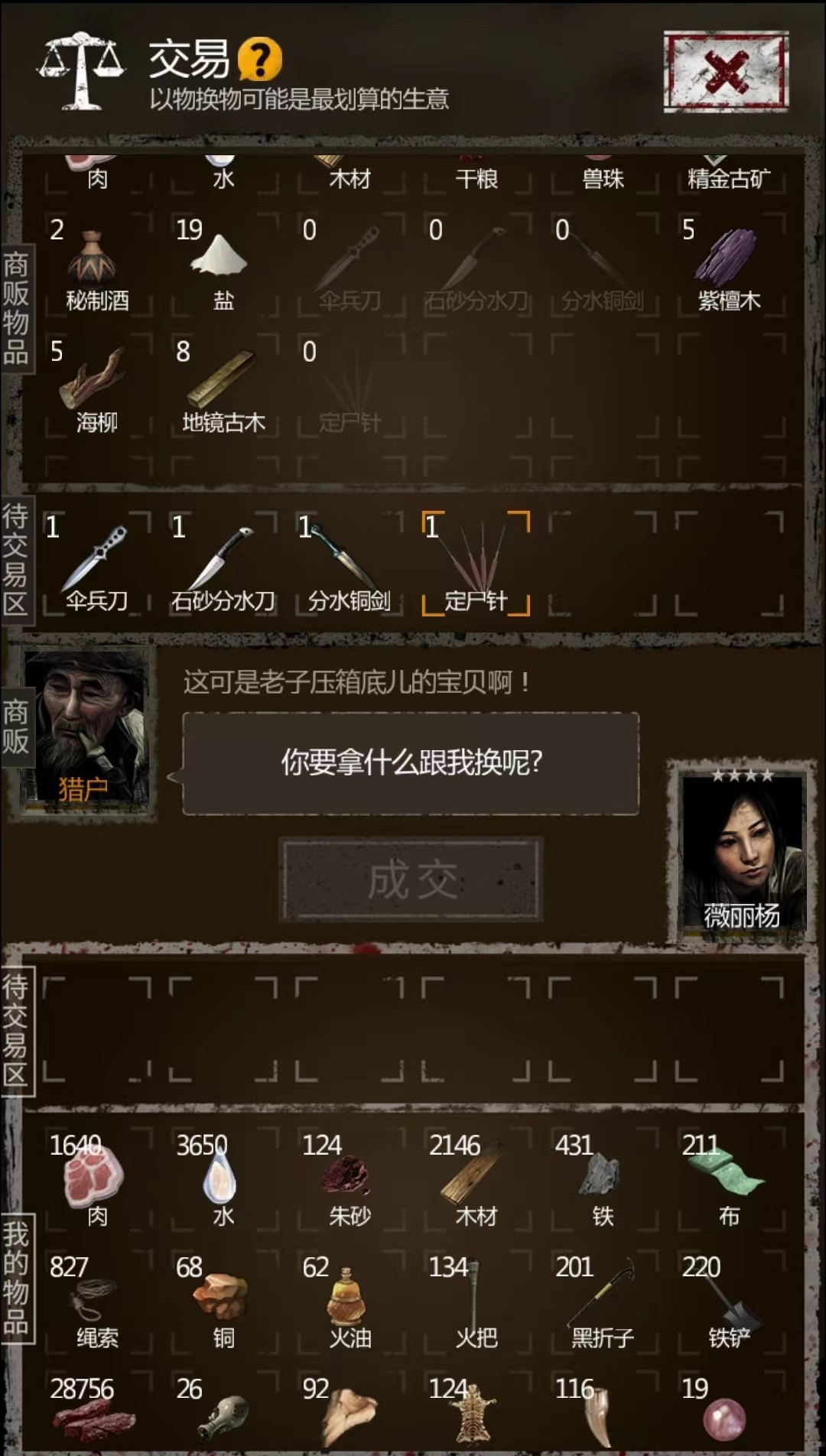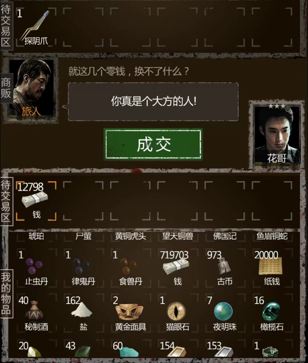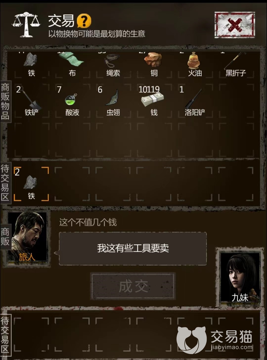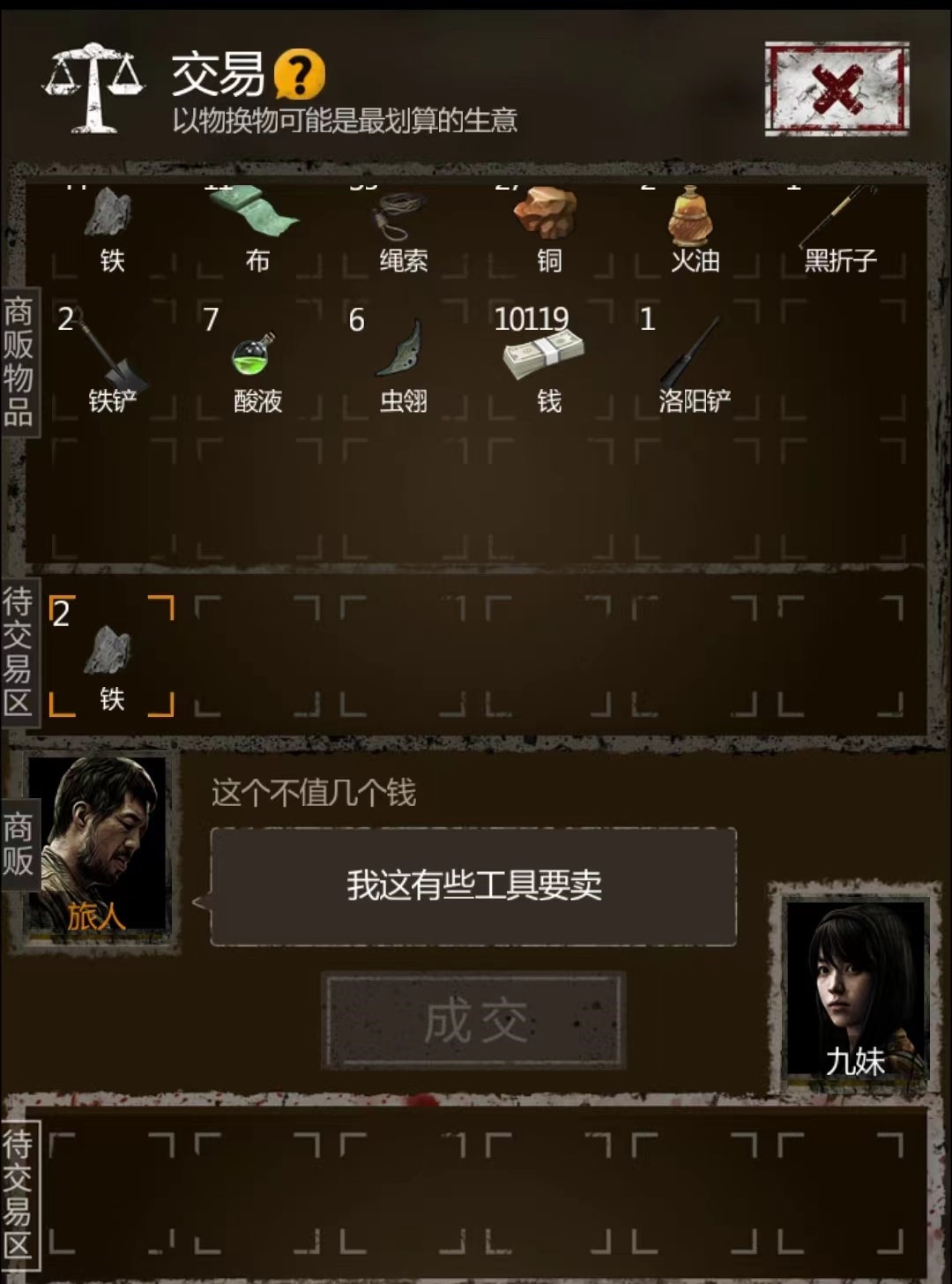 除了旅人之外,还有古董商和猎户这两个卖货郎NPC。其中古董商喜欢铁,铜,各种珠子和古董(这些最好不要给,留着给镜子聚灵升级);猎户喜欢布,绳子,火油,闷香,酸液,虫丝这些。这两个NPC来的比较频繁,缺物资升级的时候,和他们交易也是个不错的收集物资的方法。