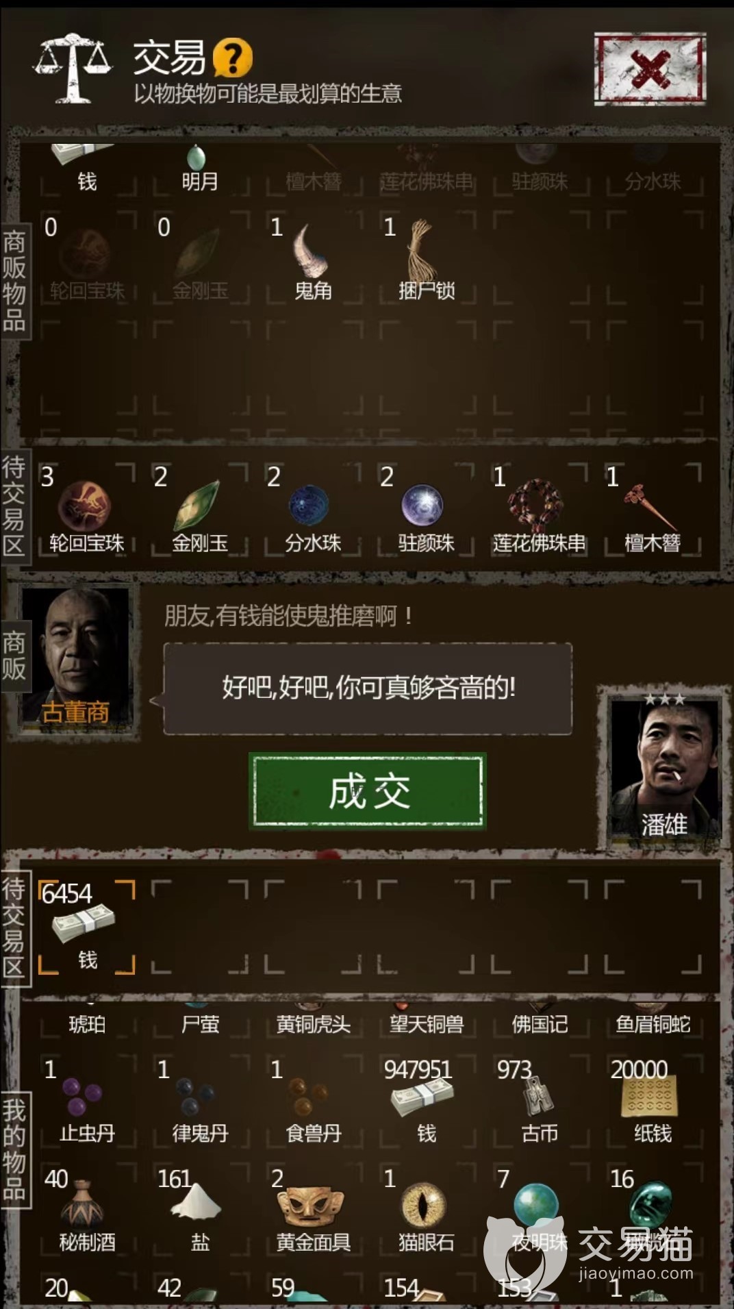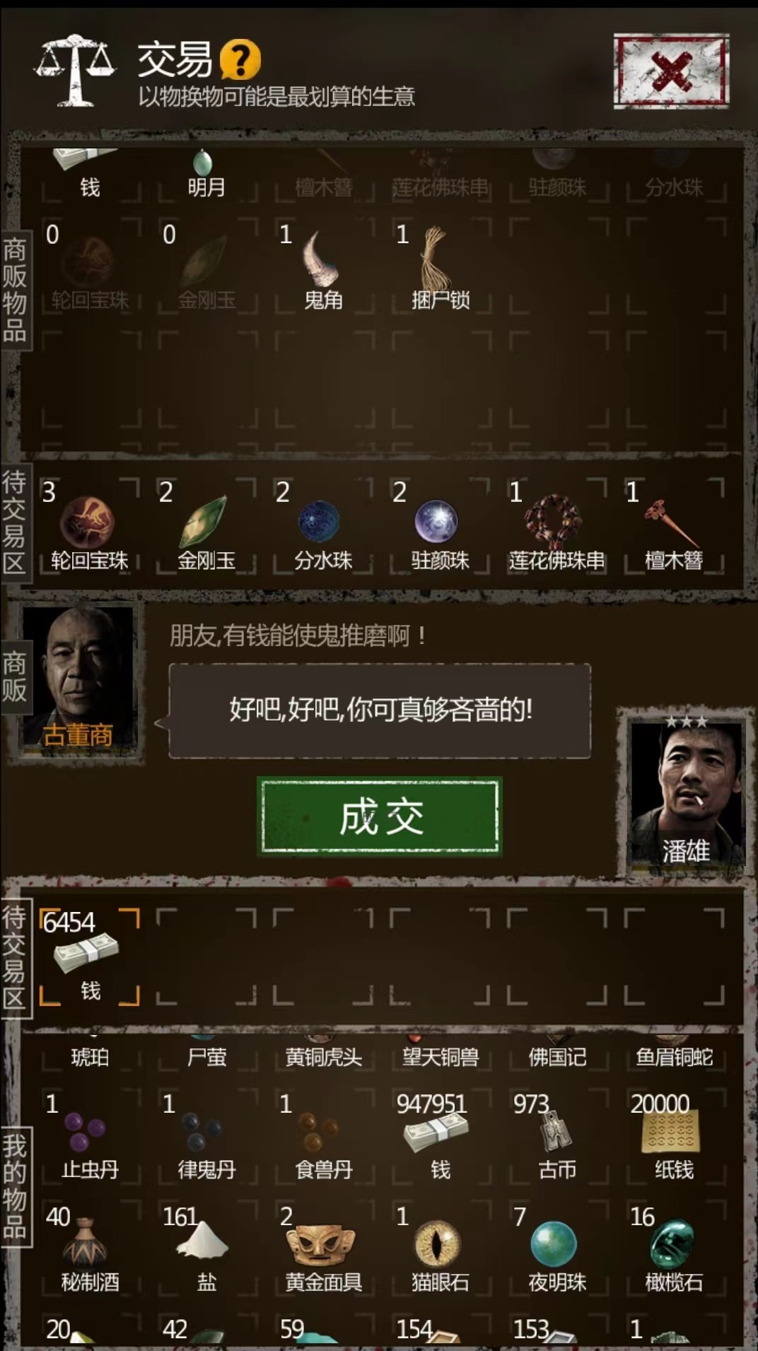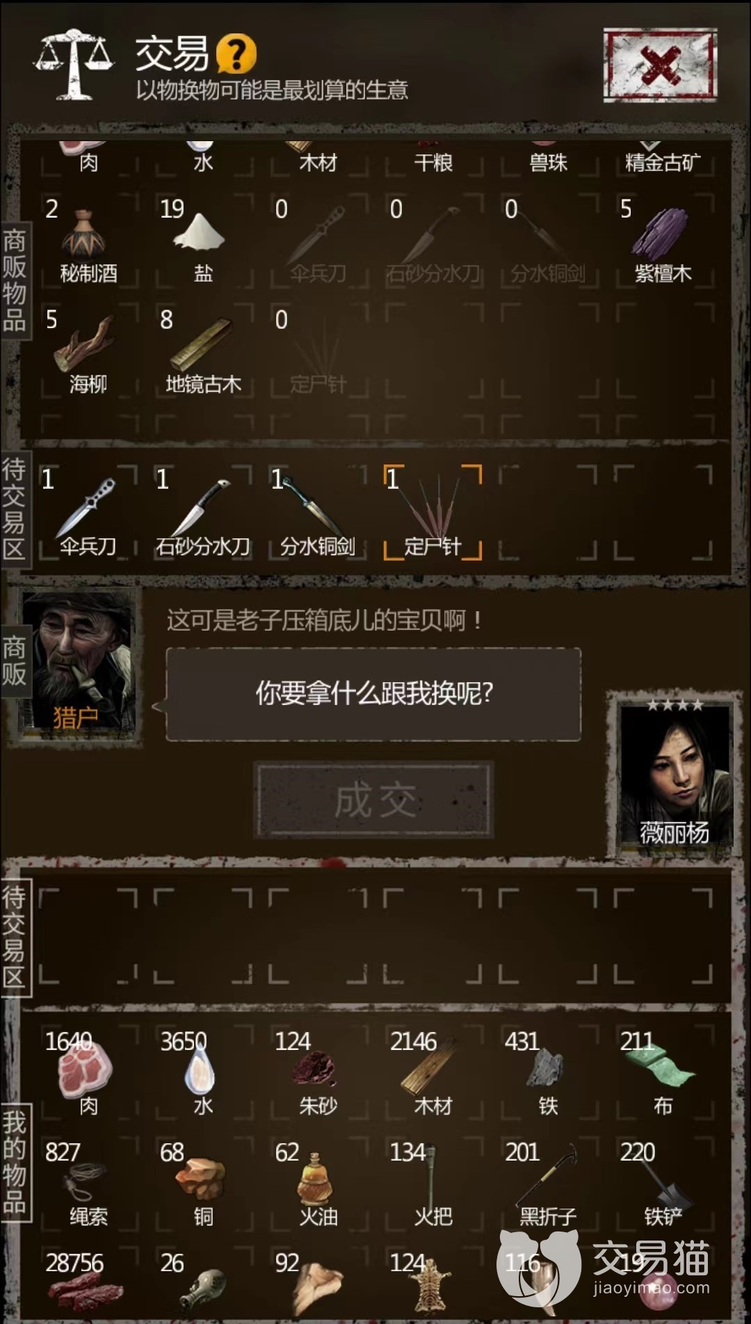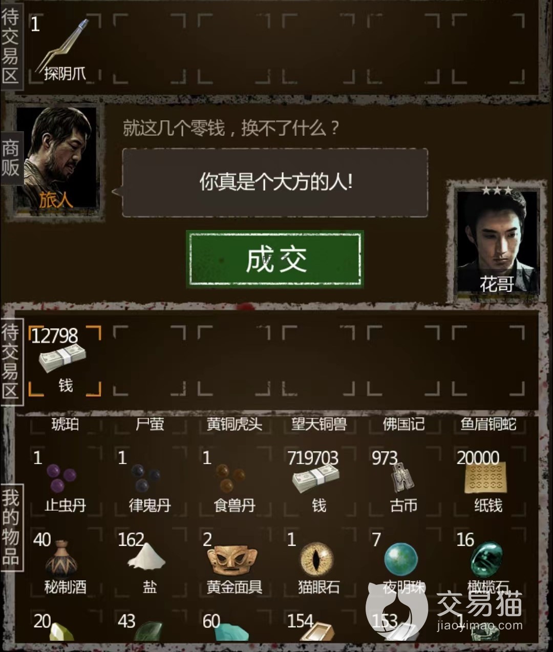 除了旅人之外,还有古董商和猎户这两个卖货郎NPC。其中古董商喜欢铁,铜,各种珠子和古董(这些最好不要给,留着给镜子聚灵升级);猎户喜欢布,绳子,火油,闷香,酸液,虫丝这些。这两个NPC来的比较频繁,缺物资升级的时候,和他们交易也是个不错的收集物资的方法。