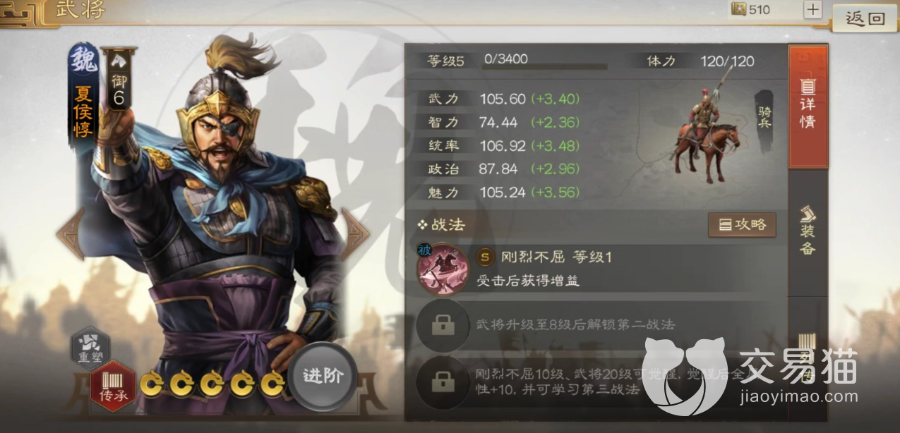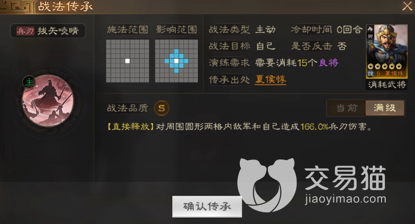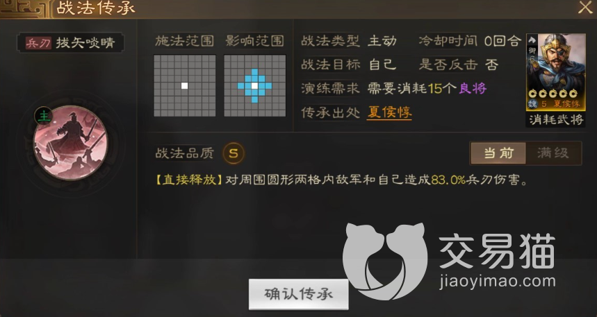 跟夏侯惇配备的肯定也是一个S级的战法了,品质虽然高,但是其实这个战法前期不算很好用,到了后期造成的效果才是比较惊人的,因为夏侯惇是一个输出型的武将,所以他的战法也是一个兵刃战法,在上面可以带来主动攻击。