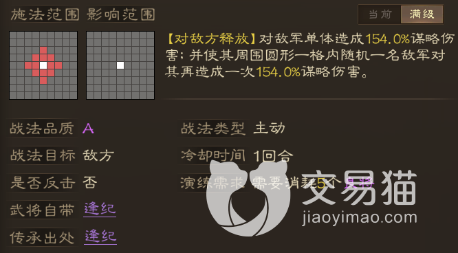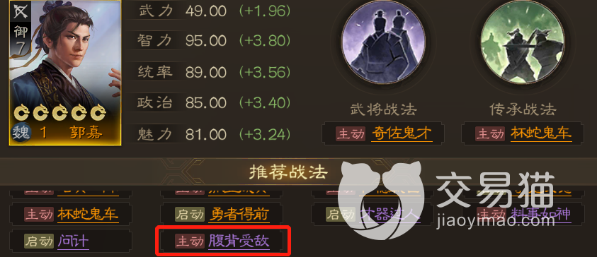 最后再给各位推荐一下这个战法的用法,它的效果是造成一次154%的单体谋略伤害,之后再对目标周围的一个友军一次等额伤害,两次伤害加一起的话总输出非常可观,不过需要高智力的谋略型武将才能发挥最大威力,而郭嘉就是最适合的人选,他自带战法的被动也能提升谋略伤害,所以带这个的话会非常舒服。