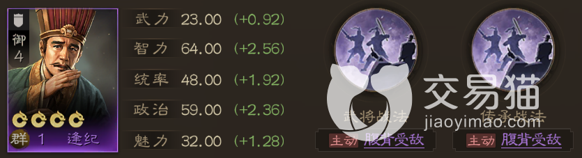 这个战法属于紫色的A级战法,所以获取它的门槛要低一些,找到对应良将然后点击传承即可获取它,这个战法对应的良将是逢纪,属于四御值的盾兵,智力在紫卡中还算不错,前期可以用来过渡一下,后期就可以把他消耗掉传承给更强的橙卡了。