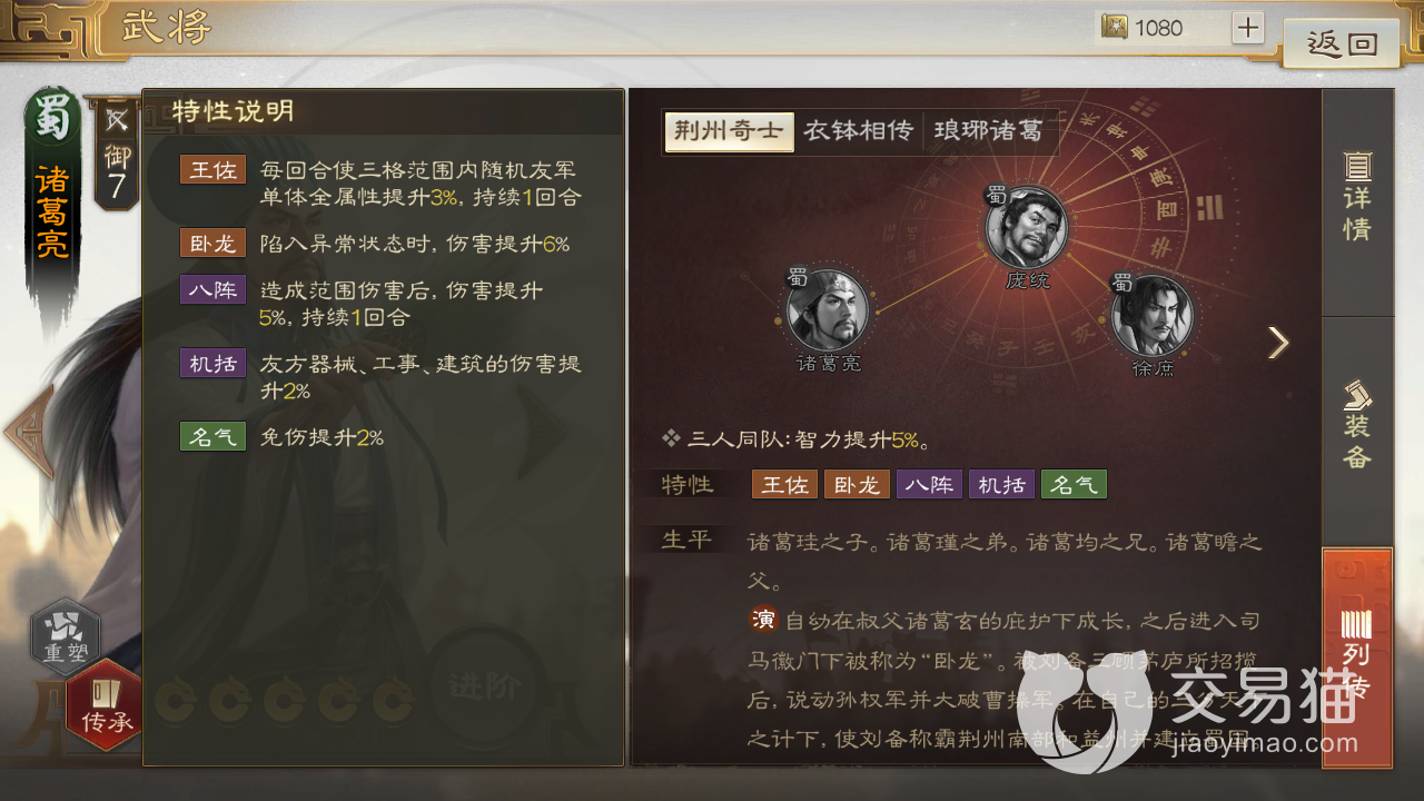诸葛亮就更厉害了,他有足足五个正面特性,其中增益团队层面的有“王佐”和“机括”,前者可以让三格范围内的随机一名友军获得持续一回合的3%全属性提升,后者则可以让友方的器械,工事和建筑提升2%的伤害,相比“王佐”,“机括”的提升更多是用于攻城和守城这两个层面。