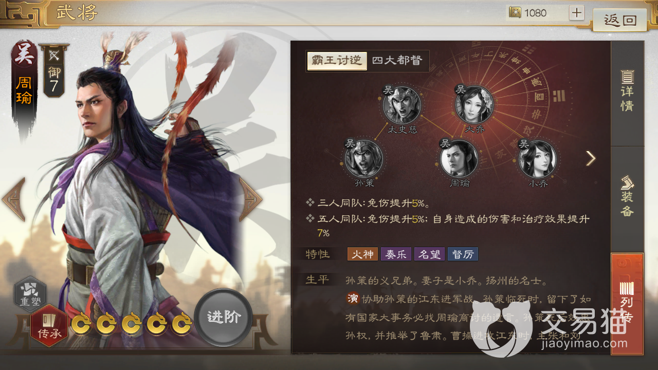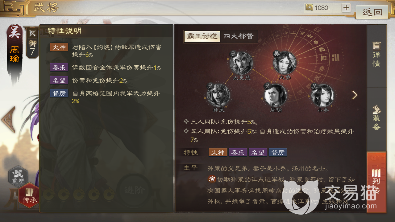 然后个人认为特性比较厉害的武将有两个,首先就是周瑜,他拥有多达四个特性,并且无一例外都是正面效果,作用分别是提高对灼烧敌人的伤害,以及对自身2%的伤害和免伤加成,再就是偶数回合内1%的全军增伤,以及对附近友军的2%武力提升。