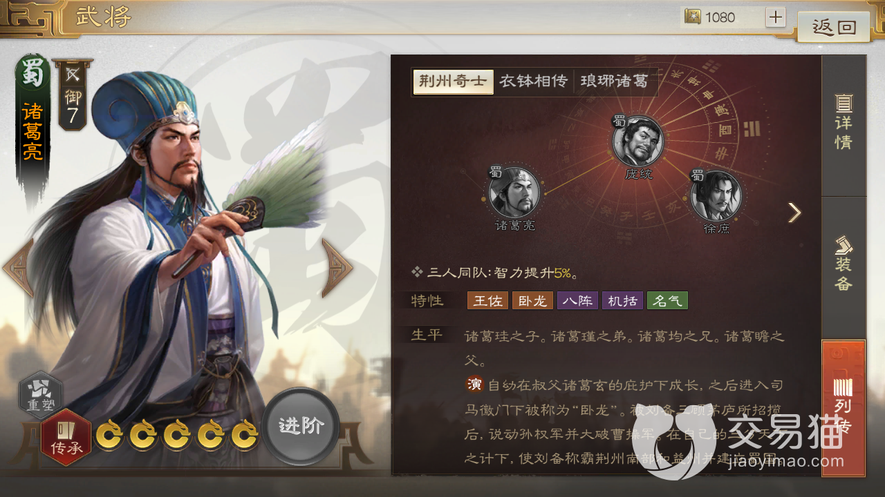 另外,对于个人层面,他也有“卧龙”,“八阵”和“名气”这三个特性用以增益,其中卧龙可以让自身在异常状态下提升6%的伤害,碰到火烧队完全可以利用这点和敌人对攻,八阵则是让其在造成范围伤害后提升5%的所有伤害,这个正好和他的自带战法八卦阵相呼应。最后“名气”这一特性则是提升2%免伤,这点让诸葛亮在生存能力上获得了一定提升,所以也是很实用的增益。