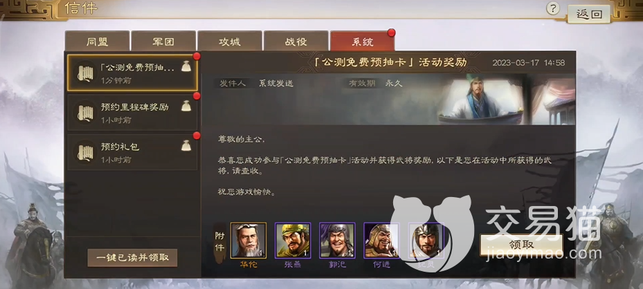 首先需要指出各位的一个误区,老玩家们常说的“开局100抽”并不是在游戏中直接领取的,而是通过官方活动,在游戏外进行的预抽卡,在完成所有任务后最多可以抽100次,而根据抽卡的结果最多可以保留1个橙将,4个紫将继承到游戏中。