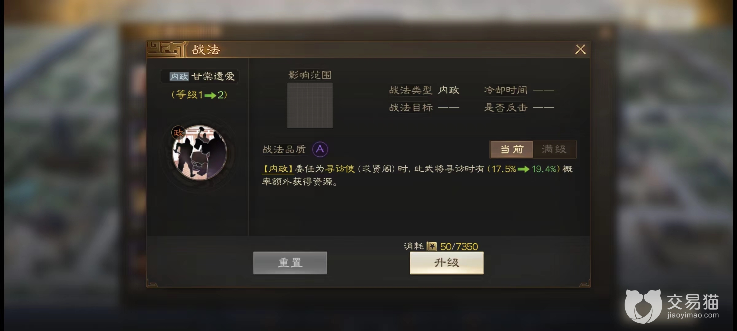 潜身远祸战法是A级战法,主要用于求贤阁使用,政厅升至7级后可以建设求贤阁,求贤阁建成后可以委任一名内政将领担任寻访使,如果该名将领配备了潜身远祸战法,会在寻访时增加获取额外资源的概率。