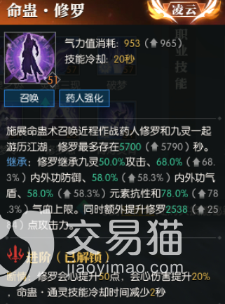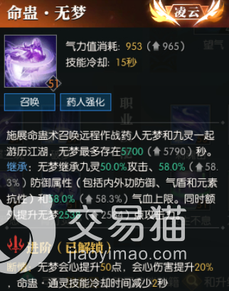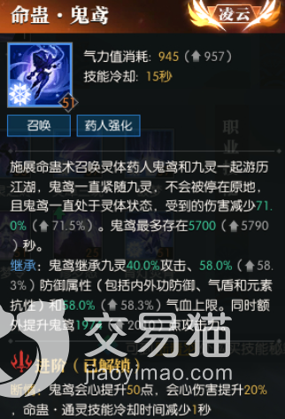 技能天赋:命蛊鬼鸢该技能可以召唤出鬼鸢,他能够继承角色的40%的攻击和58%的防御,以及58%的气血上限,还能直接额外再将他的攻击提升1974点,他等级越高的话,角色的强度也才会越高,当角色用技能的时候,他还会给敌人种下蛊种,不过大家在使用他的时候要注意一点的是,如果他与敌人距离太远的话,他就只会等在原地,不会主动向敌人进行攻击,除非敌人先攻击。