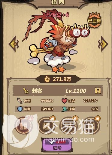 孙悟空也负责阵容主要输出,属于刺客类型角色,尤其适合越级阵容对抗,它三技能为斗神之威,消耗对手30%的血量,同时提升自身15%输出。它最大优势为叠加伤害高,后期瞬间秒杀一个对手。