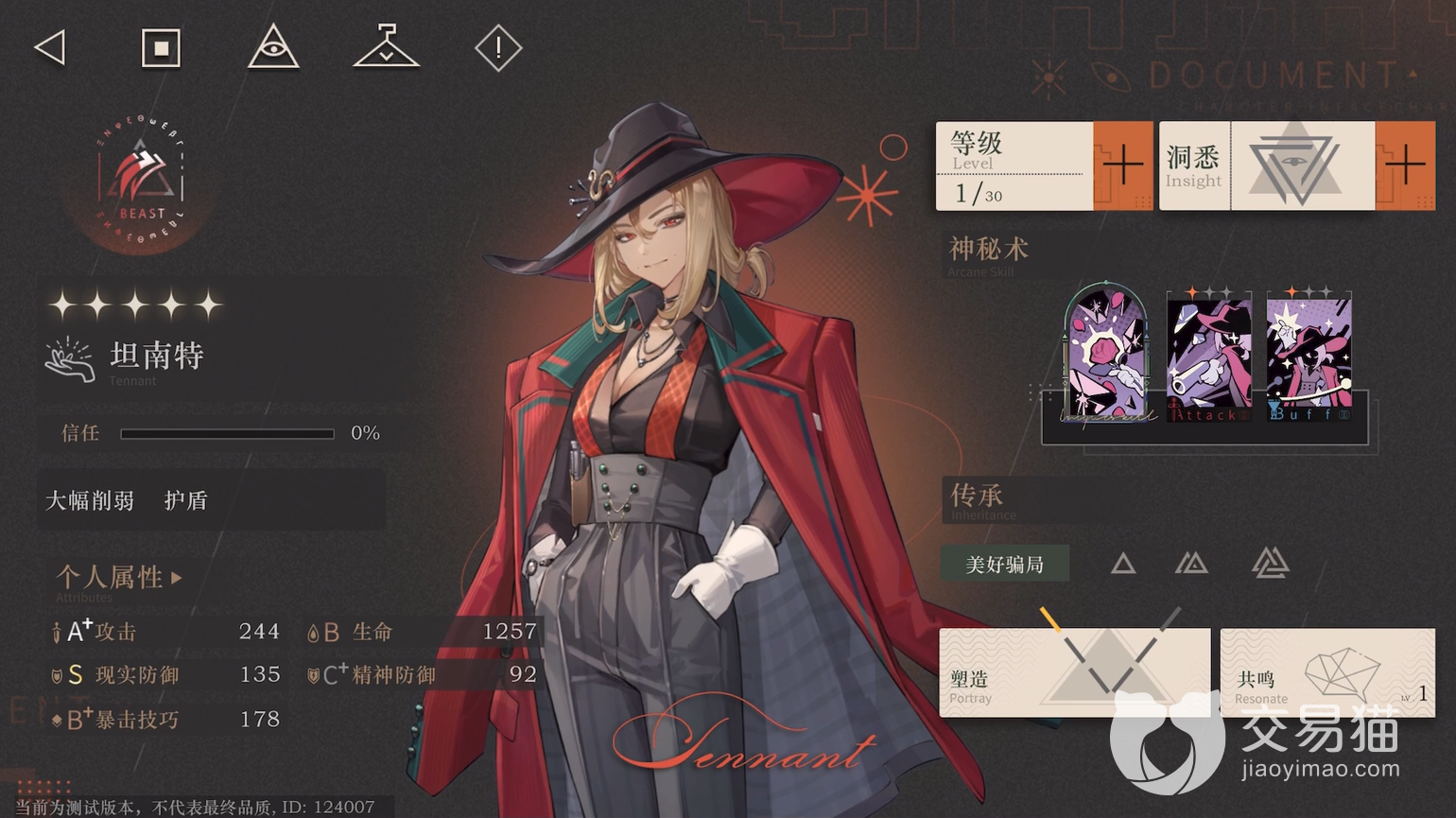 坦南特:该角色在游戏内也属于一个削弱定位,但是她除了削弱还可以作为护盾存在,神秘术【一颗真诚的心】除了造成单体伤害之外,还可以降低敌人的防御值。【一颗闪钻】造成大量的单体伤害。【一束星河】该技能是一个群体增强技能,获得护盾降低所受到的伤害。
