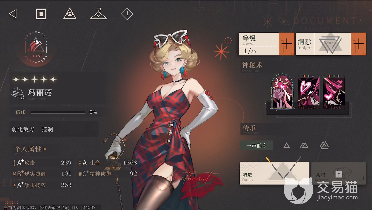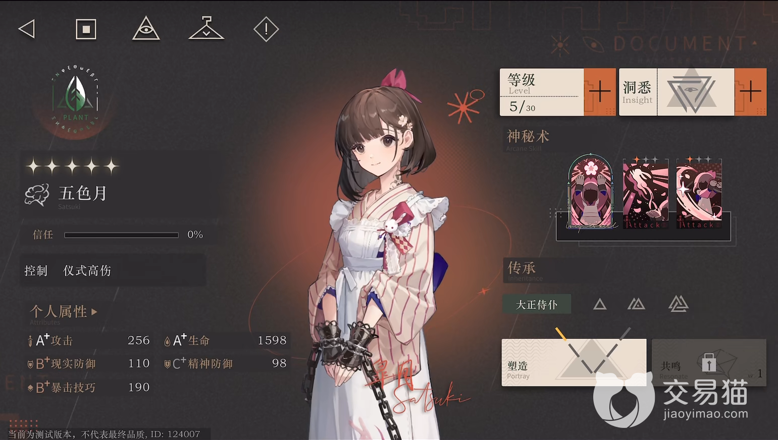 五色月:该角色在游戏内的定位是控制和仪式高伤,也就意味着该角色在游戏内属于一个强力控制辅助位置,神秘术【樱花】在对敌人造成精神伤害的同时降低对方的精神防御值。【偷香窃玉】可以对敌人造成精神伤害。【伊豆舞女】该技能可以无视敌方一定的防御值造成真实伤害,可以说是五色月的核心技能。