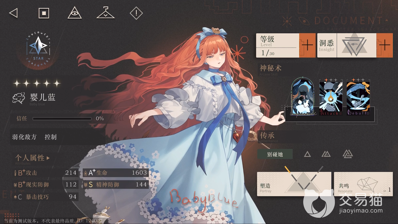 婴儿蓝:她在游戏内是属于弱化敌方和控制一类型的角色,神秘术【好朋友与茶话会】群伤技能,并可以对有负面效果的敌人进行沉默一回合。【过家家】造成精神伤害并降低敌人的精神防御持续多个回合。【咳咳剂】该技能属于一个少见的群体削弱技能,并可以持续多个回合。