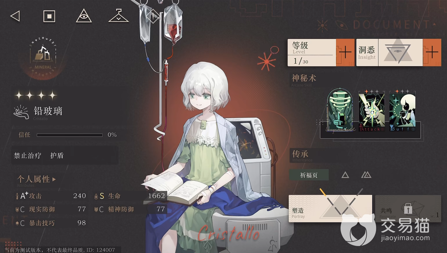铅玻璃:她在游戏内的立绘虽然看上去是一个病弱的小可怜,但她的标签却是禁止治疗和护盾,与她的外形完全不符合。神秘术【注意放射性疗法】属于一个群体减疗技能,但是在回合结束的时候会遭受到攻击,【笼中鸟】单体现实创伤攻击并降低其防御值。【无尘花】一个群体护盾技能,可以极大的提高队友的生存几率。