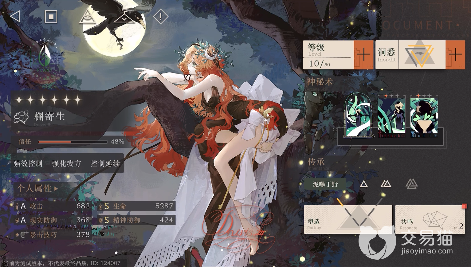 槲寄生:该角色游戏内的立绘非常贴合她的名字了,定位标签也是颇有槲寄生这类植物的风格,强化队友、强力控制和控制延续。根据标签中出现的两个控制就可以看得出来,槲寄生的技能主要就是以控制为主。神秘术【林间】属于群伤攻击技能,如果敌人处于槲寄生的控制效果内,该技能会延长控制效果一回合。【风入林】槲寄生的控制效果,可以让敌人陷入沉默,可以延长控制。【露渐白】属于一个群体增强技能,与奶妈配合使用可以增强友方的治疗量。