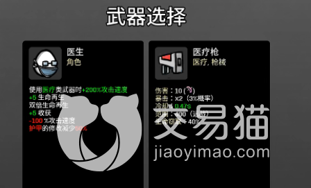 医生,也是一个很强的角色,这位角色的能力可以让它在游戏开始获得10点的初始值,在实战中用医疗武器的攻速也会翻倍,生命回复的回复量也会翻倍,但是速度会减少百分100,这个角色在拿到医疗武器之前非常容易暴毙,因为移速极低,很容易溜不了怪被怪物围殴,但是一旦拿到了医疗武器就不一样了,有了医疗武器之后就完全不用担心移速问题了,拥有医疗武器就能硬吃怪的伤害站桩输出。