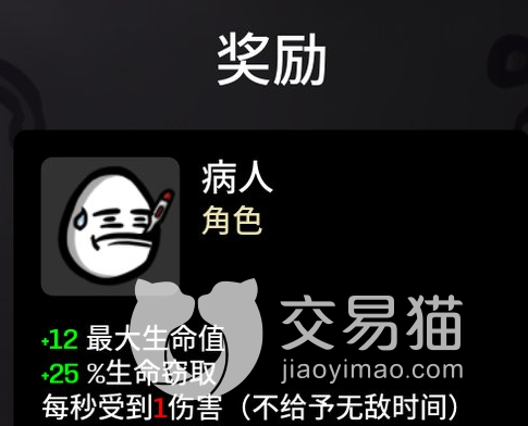 病人,这位角色是一位操作相对轻松的角色,该角色的能力可以让他获得百分之25的吸血,但是代价是每秒会掉一点血,除此之外这位角色的生命回复也会减少,但是会增加12点额外的生命值,这位角色在实战中反正是非常轻松的,适合低难度模式下来玩,低难度模式下玩起来会非常爽,装备稍微正常一点就可以做到站桩输出的效果。