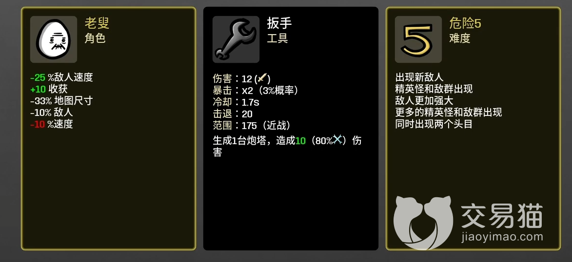 老叟,该角色可以让怪物的数量减少、移速减少,自身的移速减少一点,他这个自身移速减少的代价和大壮不一样,他只是小幅度减少并且当局的怪物移速也会减少,这样来看他的移速减少的debuff等于没有,实战中他只要叠暴击就会有非常不俗的伤害,走双暴流收益非常高,带个电击枪随便抓个盾牌就能乱杀前20波,之后经济只要不算太差,在后面的无尽模式中也是非常轻松的能三十波往上。