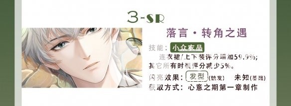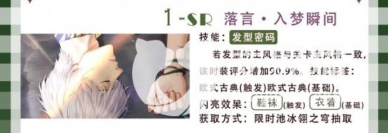 作为SR品质的卡牌这里要介绍的是三个,其中一个是落言的“入梦瞬间”,想要获取它是需要在限定的卡池中抽取的,相对来说会比较困难。而它的主要功效是如果各位的发型风格与这场对局中的相同,那么评分就会得到提升。
