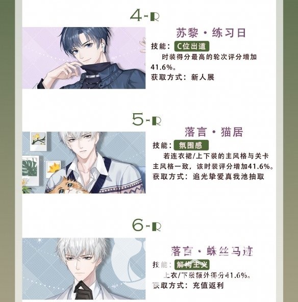 而这个属性的R品质卡牌有三种,其中有两个依旧是落言的,另一个是苏黎的,这些的获取方式也有所不同,而卡牌的主要效果就是提升不同装扮的分数,只不过不同的卡能够提升的指数是不一样的。