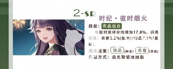 另一个同属性的为时纪的“彼时烟火”,这个也是通过抽取获得的,主要的功效是每场时光的分数都会进一步提升百分之十七点八,同时这里的另外效果是饰品和衣着会增加一定的闪亮属性。