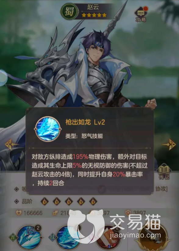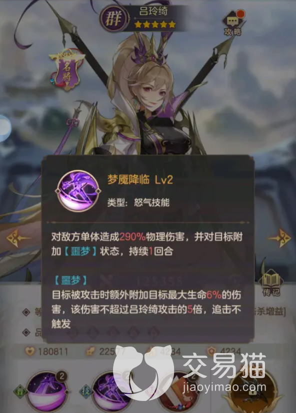 以怒气技能出名的武将,其技能不仅会给敌人输出成吨的伤害还会让敌方进入噩梦状态,持续一回合,这个技能的效果可以让自己的全体阵营激发,配合赵云这种暴击输出流实在是无懈可击。
