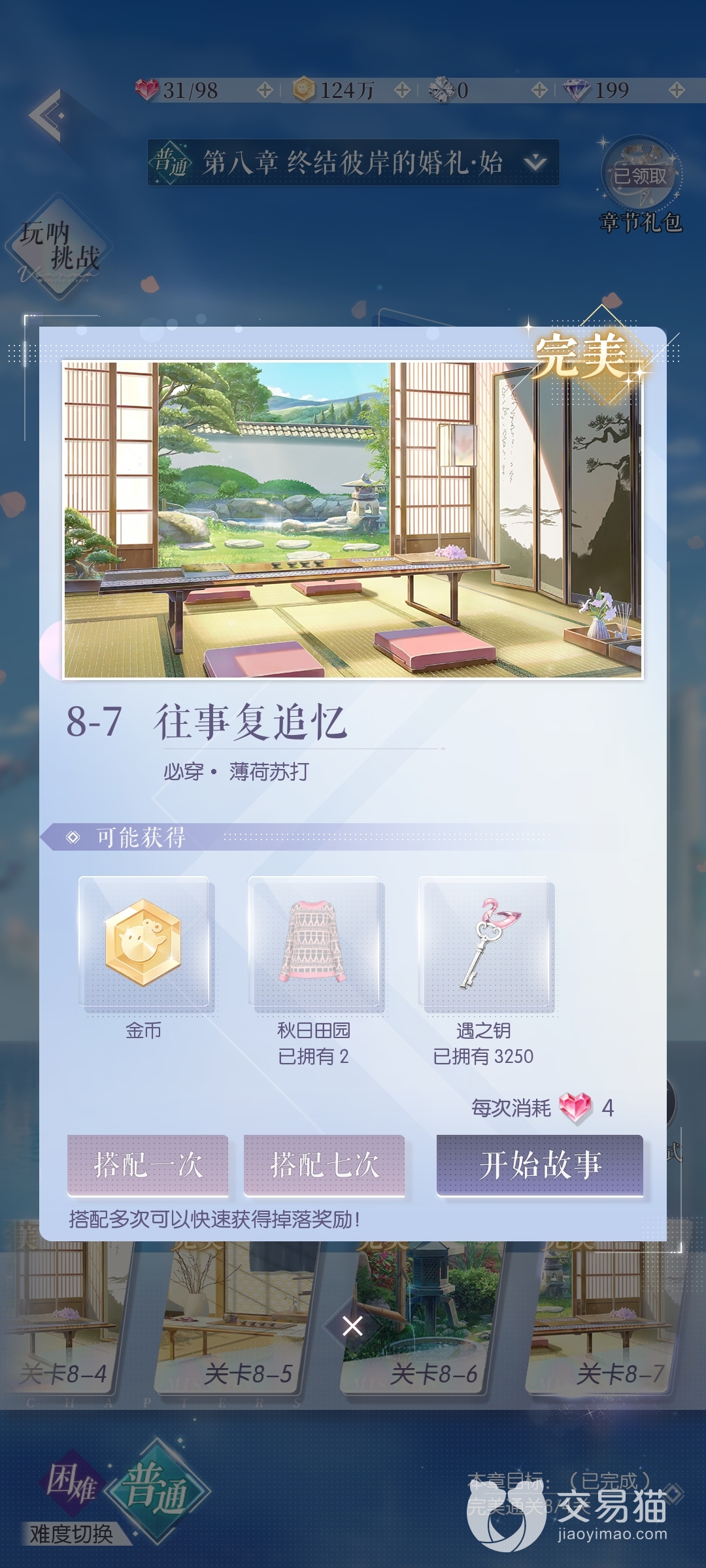 除了8-4以外,8-7也是一样的,需要我们获取固定的服饰,我们根据上面的操作进行就可以了,等通关以后,回到章节界面,点击右上角的“章节礼包”并领取就可以了。