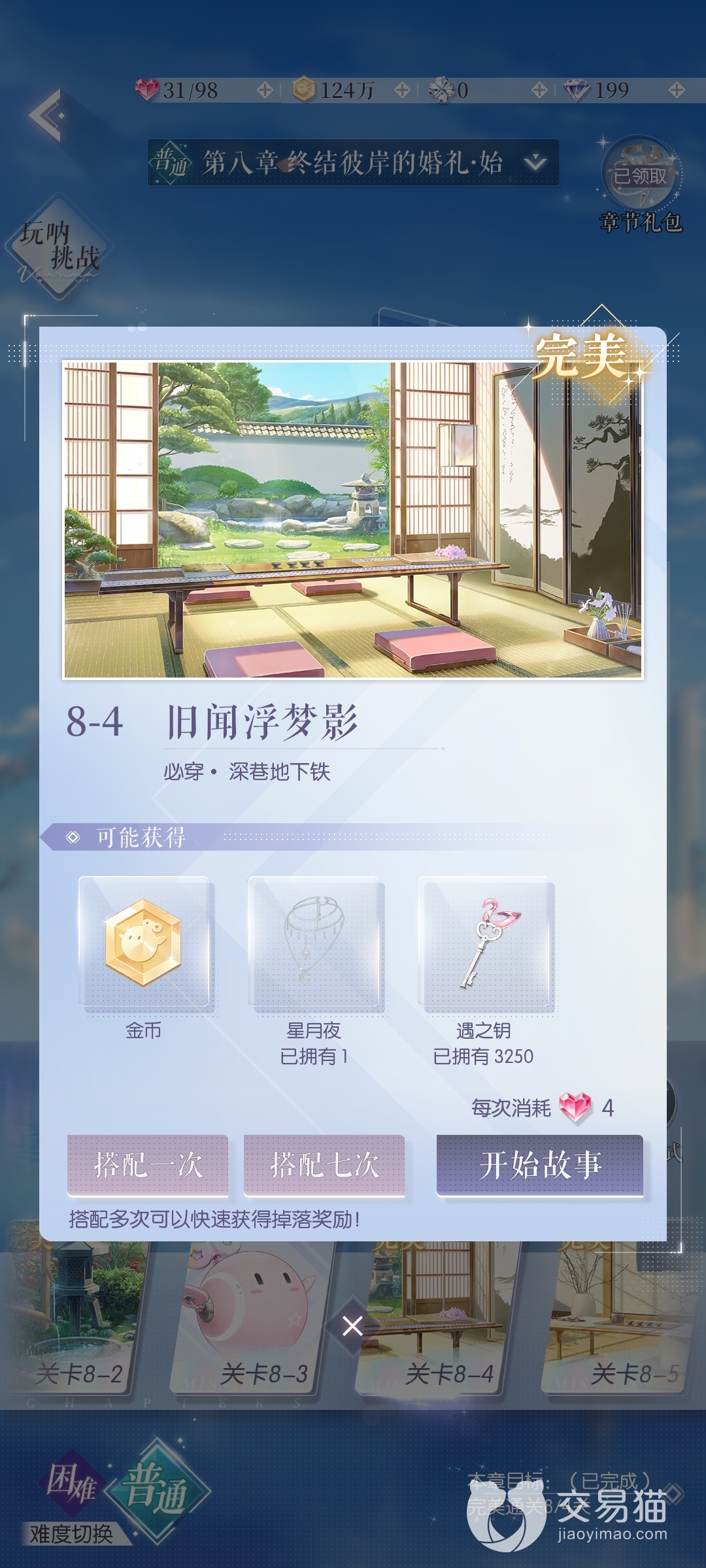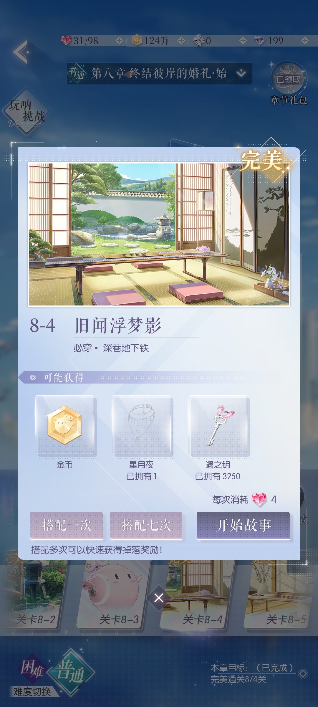 第八章需要至少有4关的完美评价,还是比较简单的,难就难在有些关卡需要固定的服饰,比如8-4这一关,必穿一件“深巷地下铁”,我们可以点进关卡,然后再选择必穿的物品,这样系统就会自动跳转获取方式了,不用我们自己一个个找,非常方便。