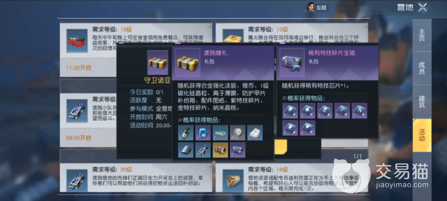 1、在每周六晚20点,玩家们可以去参加营地的大型活动“守卫诺亚”。这个活动可以获得渡鸦赠礼,有一定机会开出稀有的特技碎片宝箱、极品特技碎片宝箱等道具。这个活动在营地的市中心举行,主要是让玩家去保护位于市中心的“通讯电波器”,并抵御12波来袭的户潮。