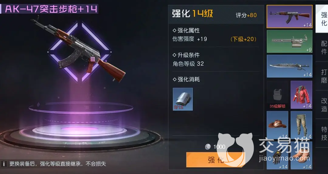 3、装备配件:然后就是武器的配件了,这个也是可以提升战力的,防具加固也是提升战力之一。接着就是给装备强化打磨,这些会随着等级越高,成功率就会越低。这样就需要玩家氪金或者是慢慢的积攒了。
