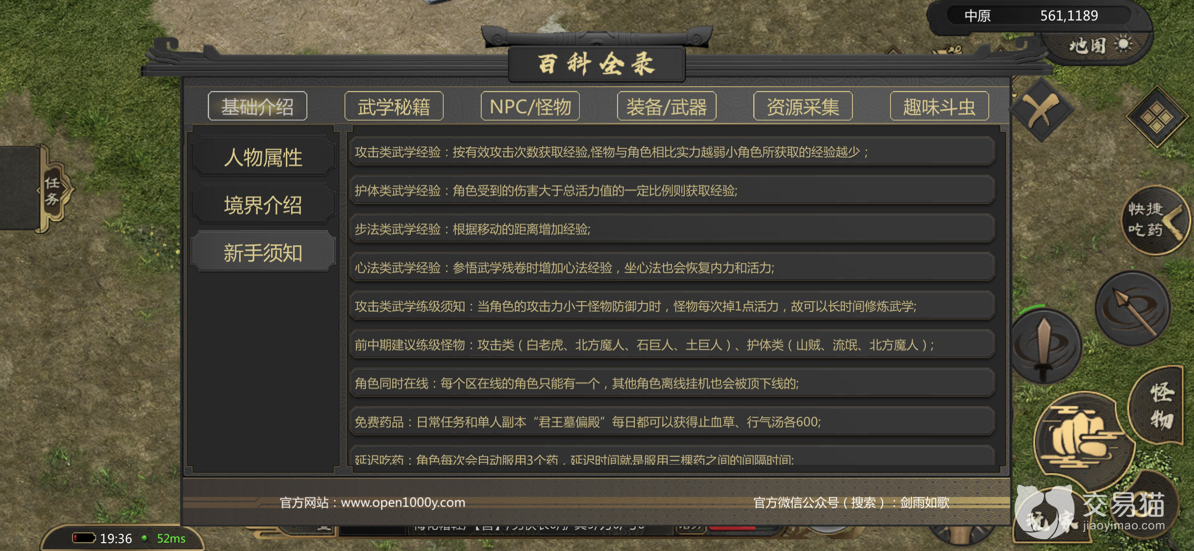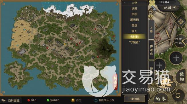 3、游戏进阶过程。游戏小白们走完了新手村就来到了中原,后续的升级之路也就在这个地图上开展了。因为游戏的的设定,玩家们后续升级之路都是要靠自己的,也就是说后续怎么玩全靠玩家自己摸索了。这个时候,玩家们先不要着急,找到新手村后在中原遇到的第一个NPC,可以发现这是一个卖商品的老板娘,想要买东西就得要铜钱。但是新手没有铜钱,想要铜钱就得打开百科,里面显示有些怪物击败之后会掉落铜钱,这就是这个游戏中铜钱的来源。