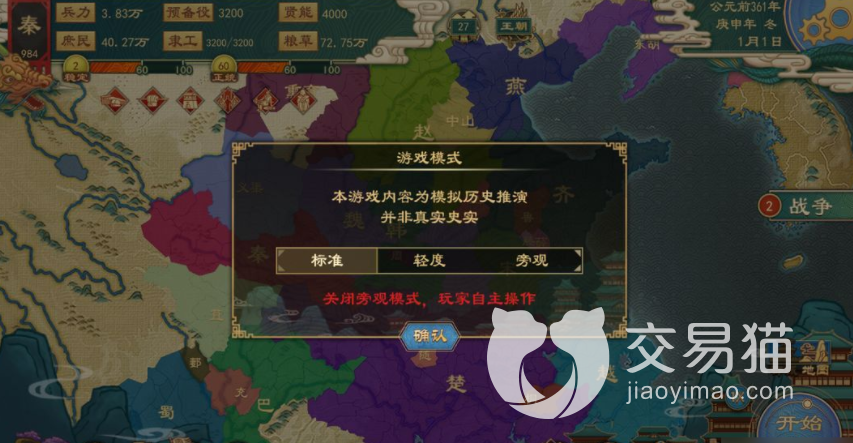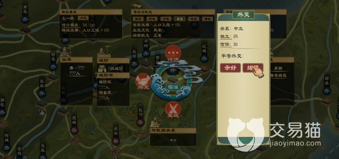 我们要实现合纵,还得和其他国的国君保持一个比较好的关系。这样的话,不至于出现被其他国家陷害,导致自己灭国的局面。玩家需要积攒到足以跟大国国力抗衡的小国数量,游走于各个小国之间,最终实现合纵联合灭掉大国的目的。