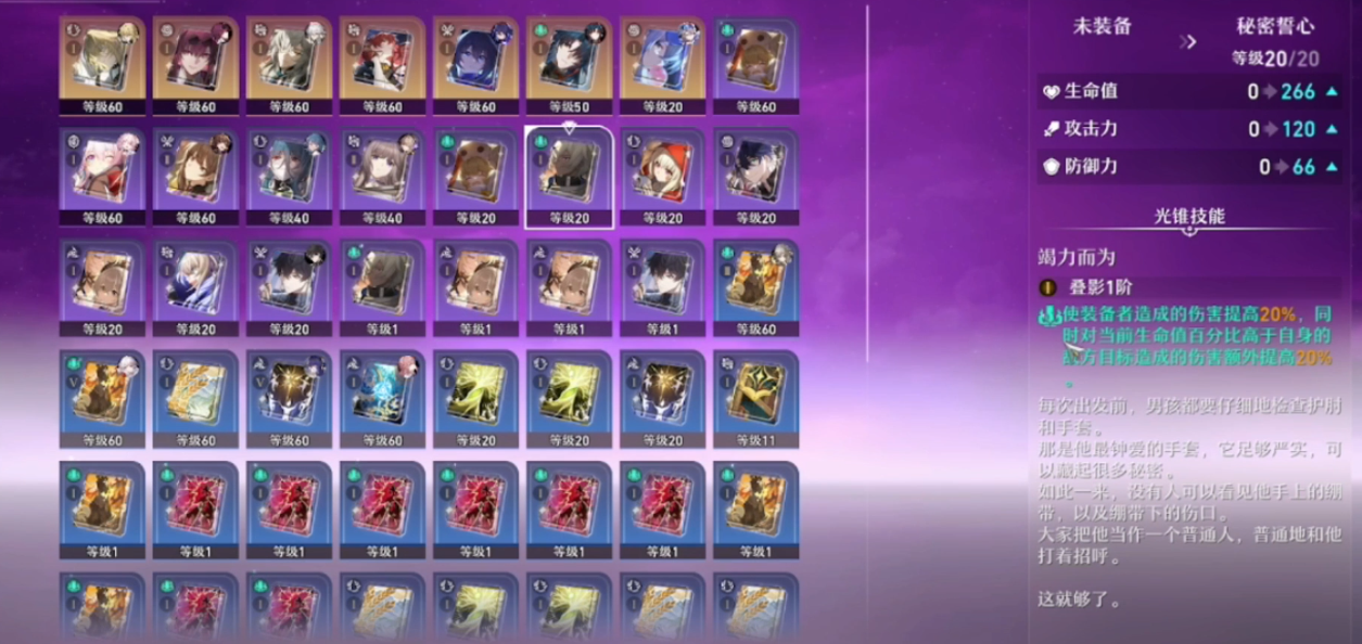 1、秘密誓心。提升三成伤害,同时在打血条比自身高的敌人可再加三成,理想的状态是翻1.6倍率,但是一阶的是1.2+1.2倍率,单纯一阶效果不如三阶光锥天倾。
