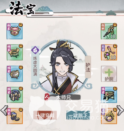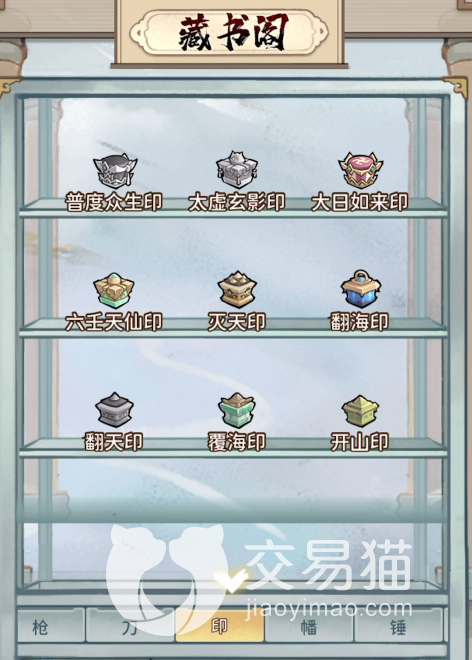 鼎,这件装备的属性和刀一样,不过这件装备是治疗类型装备,是游戏中唯一一个奶妈装备,任何奶妈职业都可以装备使用,金属性的鼎可以释放群体奶,木属性的鼎额可以释放单体奶,土属性的奶则可以清除自身的负面属性。印,这件装备是一件控制类型的装备只有土属性,它的效果有概率造成眩晕,这件装备适合酱油角色携带。