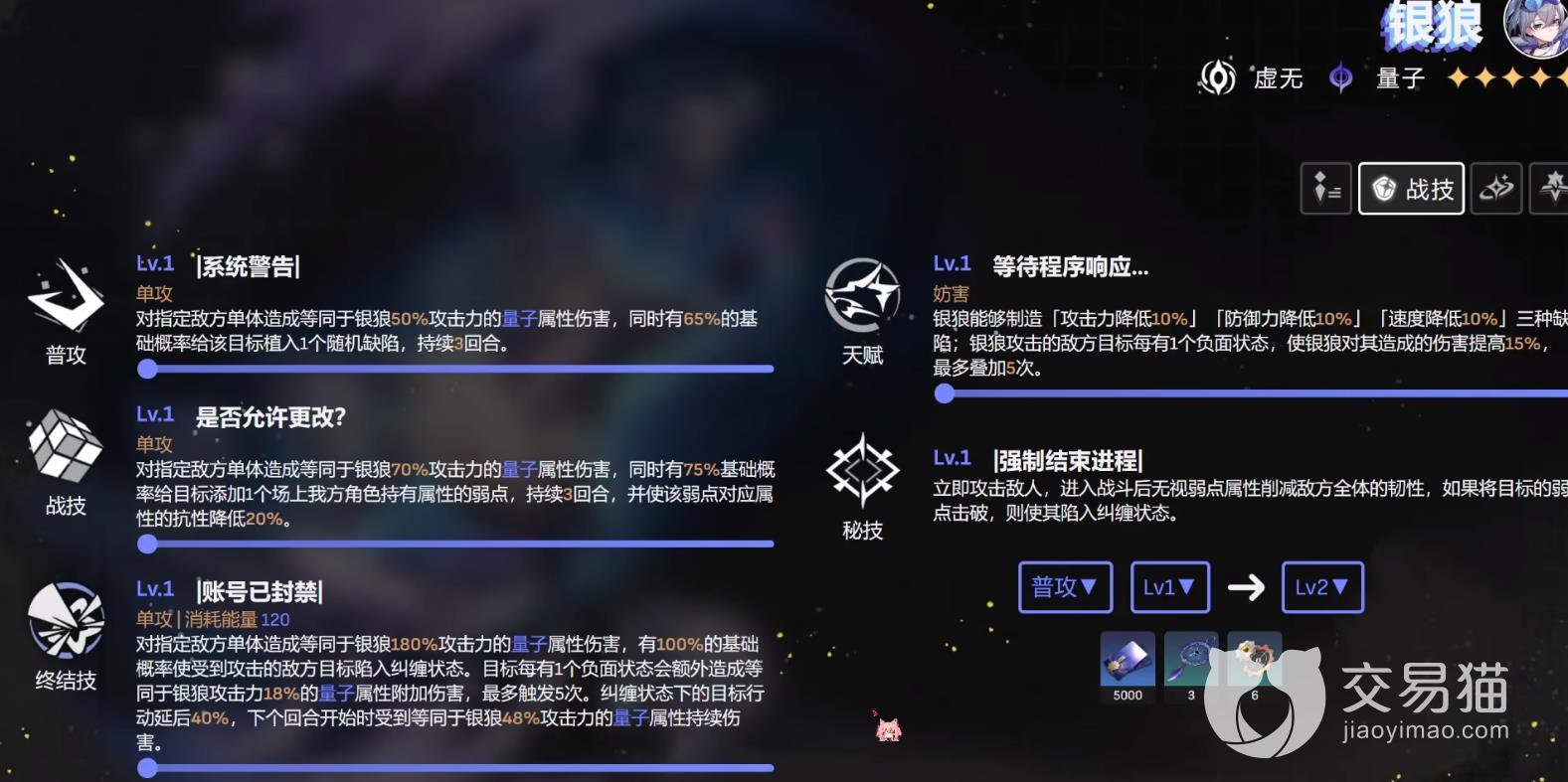 银狼是一个虚无,量子角色,她的一个天赋是能够对对手造成三个大buff,降低攻击力,防御力和速度们虽然造成的效果不多,但是重在是能够造成三个buff,并且在特定条件下,还可以提升一定的自身伤害,并且最高能叠5次。