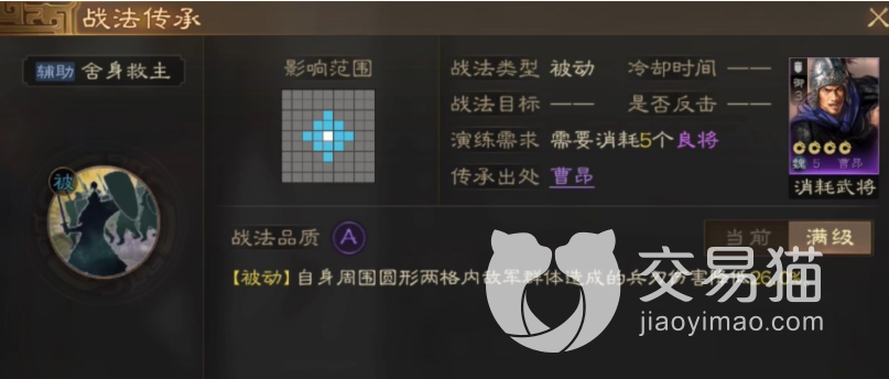 舍身救主这个战法技能属于被动型技能,也就是不需要释放任何技能就能触发效果的,唯一来源就是消耗五个武将角色曹昂,就能将这个战法技能传给其他武将角色了。小编比较建议的是,将这个技能给到华佗,这个角色的定位是辅助角色,搭配上舍身救主战法后,能够直接提升华佗自身的抗伤能力,这就意味着,提高触发华佗免伤的概率了,这一点在对战中至关重要,经常是反败为胜的关键所在。