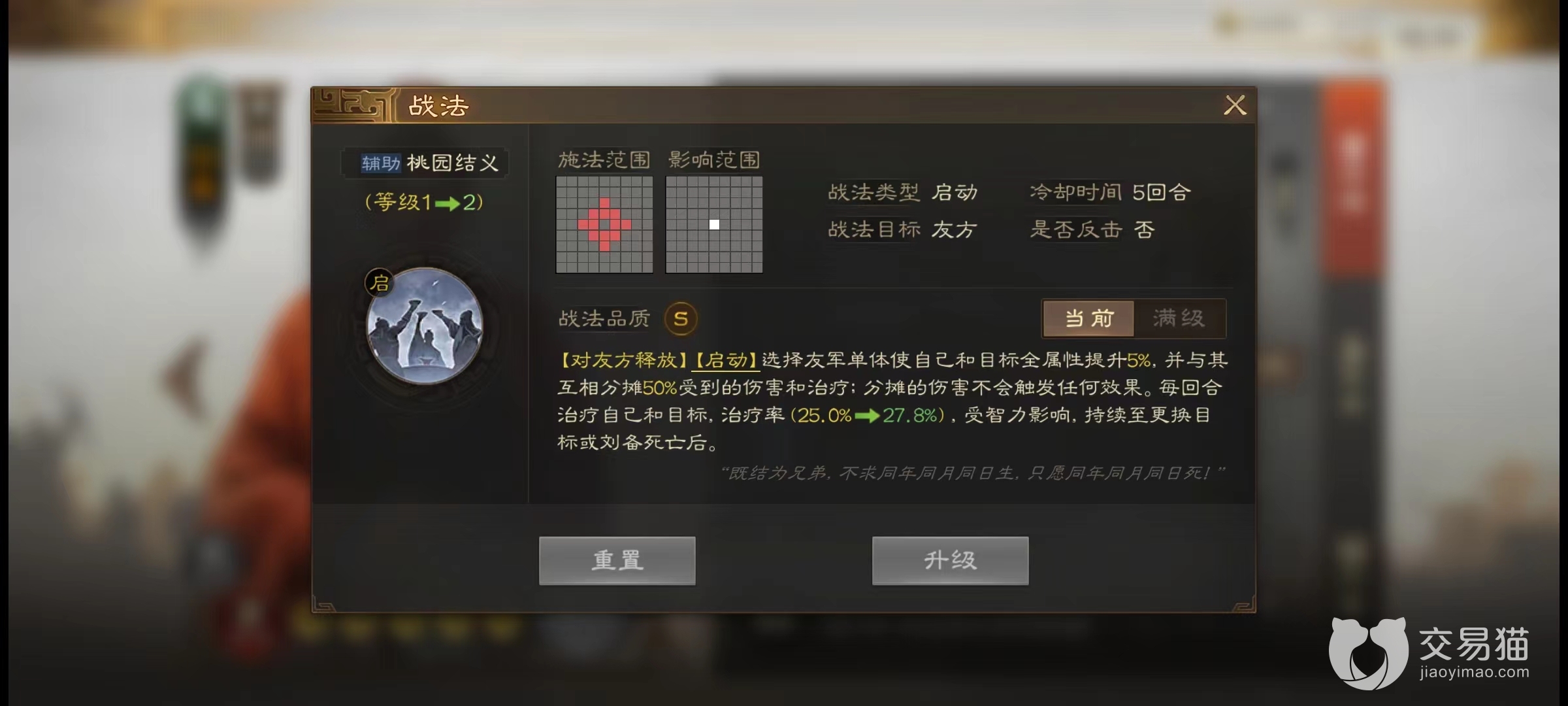 刘备自身携带的战法叫做桃园结义,这是一个辅助战法,主要使用于分摊伤害和治疗,这个战法每回合可以治疗刘备和指定的一个友军,并且提升双方的全属性,激活方法需要主动释放,可以在第一回合释放,因为这个战法是启动战法,施法后不影响行动,可以继续攻击。小编认为这个战法已经把刘备定位在一个辅助型肉盾的位置,所以第二三战法建议补充增益战法或者治疗战法。