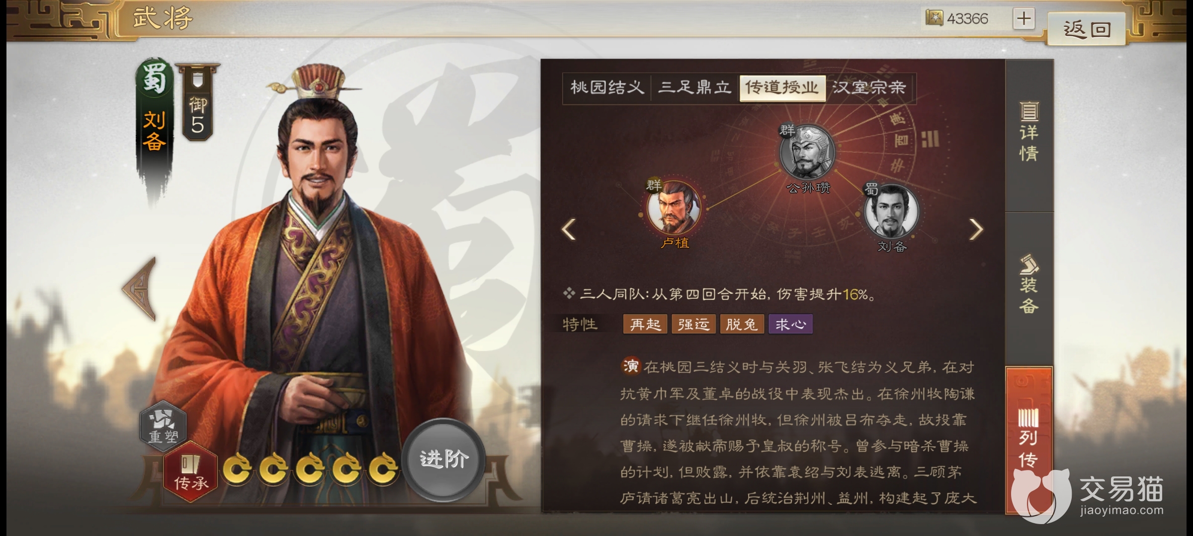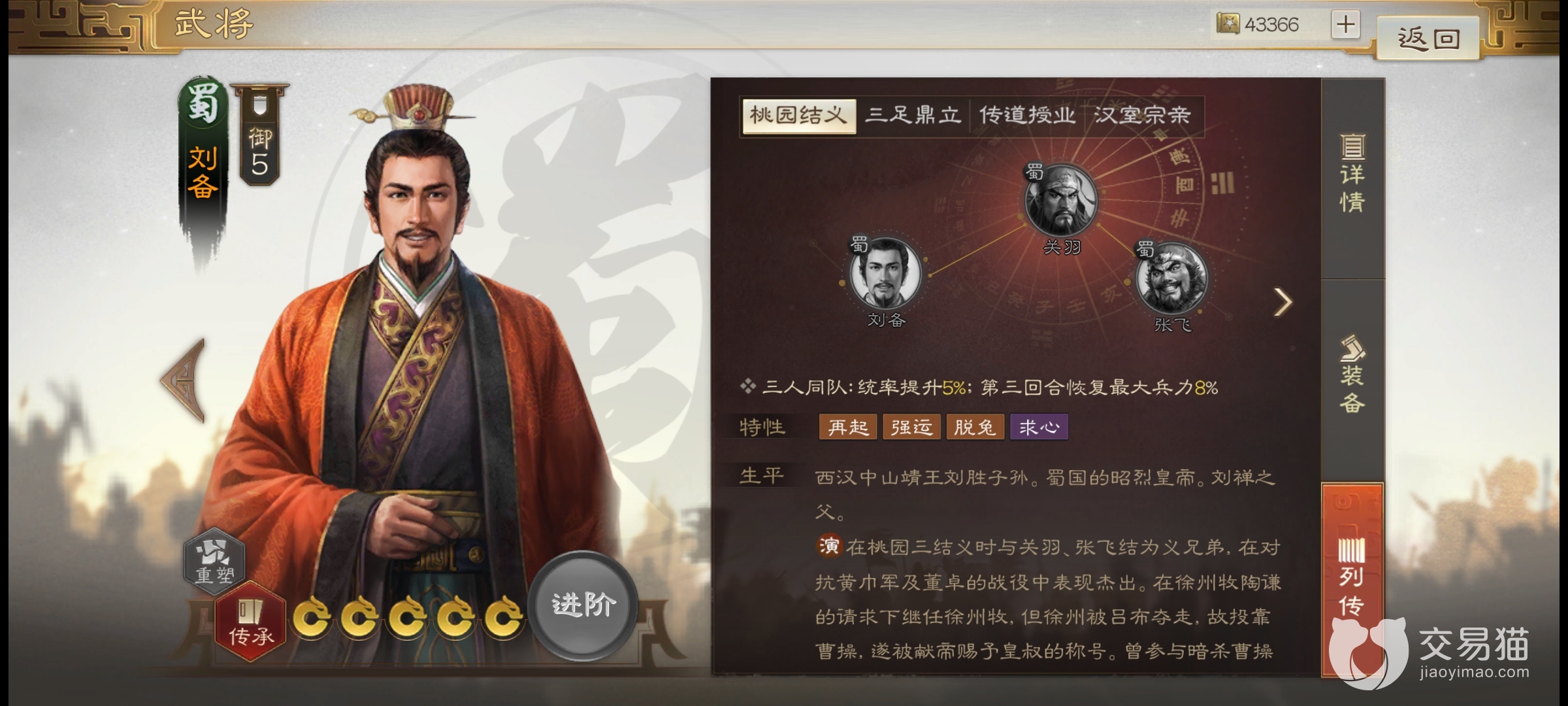 武将刘备的人物特性有四项,分别为再起、强运、脱兔和求心。“再起”的加成是恢复自身4%的最大兵力,触发条件是在每个偶数回合后,这个特性可以增加队伍的续航,在持久战方面有所帮助。“强运”的效果是增加2%的闪避率,虽然这个概率不大,如果后期有了特殊装备和战法,概率提升后,只要触发一次可能就是整个战局的改变。