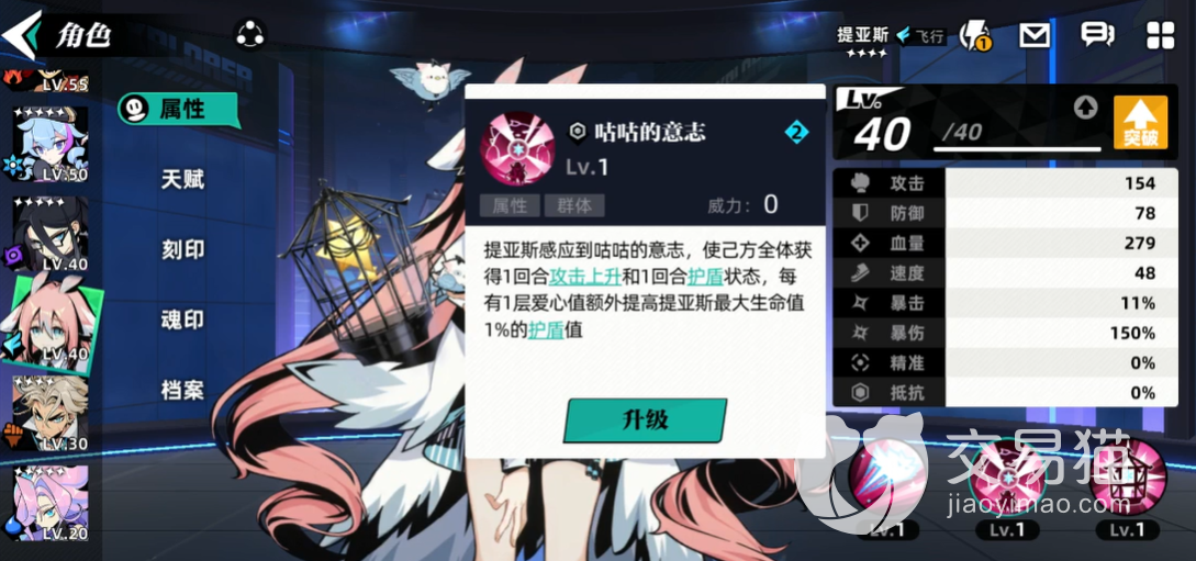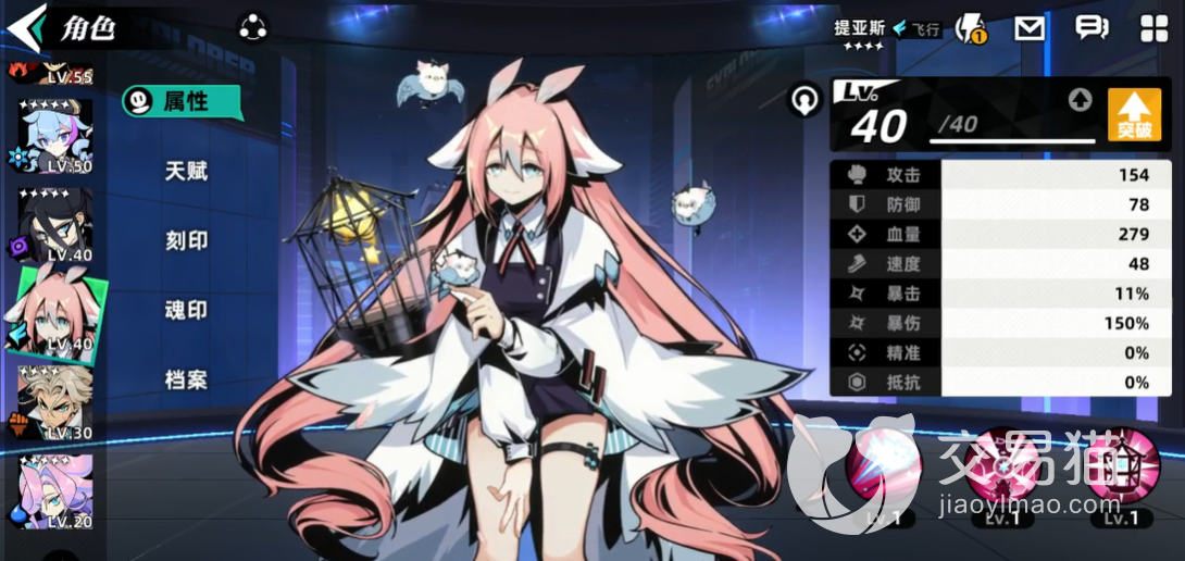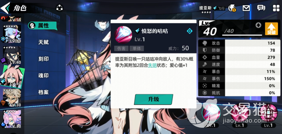 提亚斯作为一个女性角色,在外形上面也是很温柔的,在游戏中的人设是比较内向胆小的性格,在战斗方式上面跟其他的角色有很大的不同,一技能是愤怒的咕咕,这个技能在游戏中可以带来单体伤害,可以召唤出来一只咕咕,然后有一半的几率给目标造成失明状态,失明状态可以持续两个回合,击中之后大家就可以获取2点爱心值。