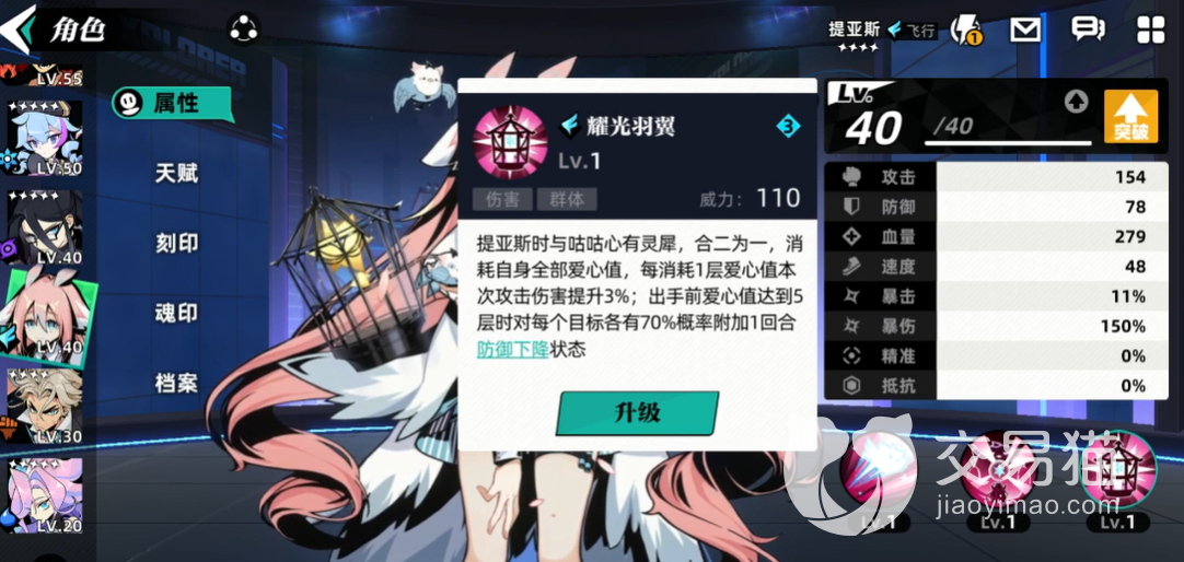 耀光羽翼是最后一个大招,在游戏中可以让咕咕跟提亚斯合二为一,使用这个技能的时候会消耗自己所有的爱心值,每消耗一层就可以让这次的攻击能力往上提升5%,达到了5层之后就可以有70%的概率让对面的防御下降。