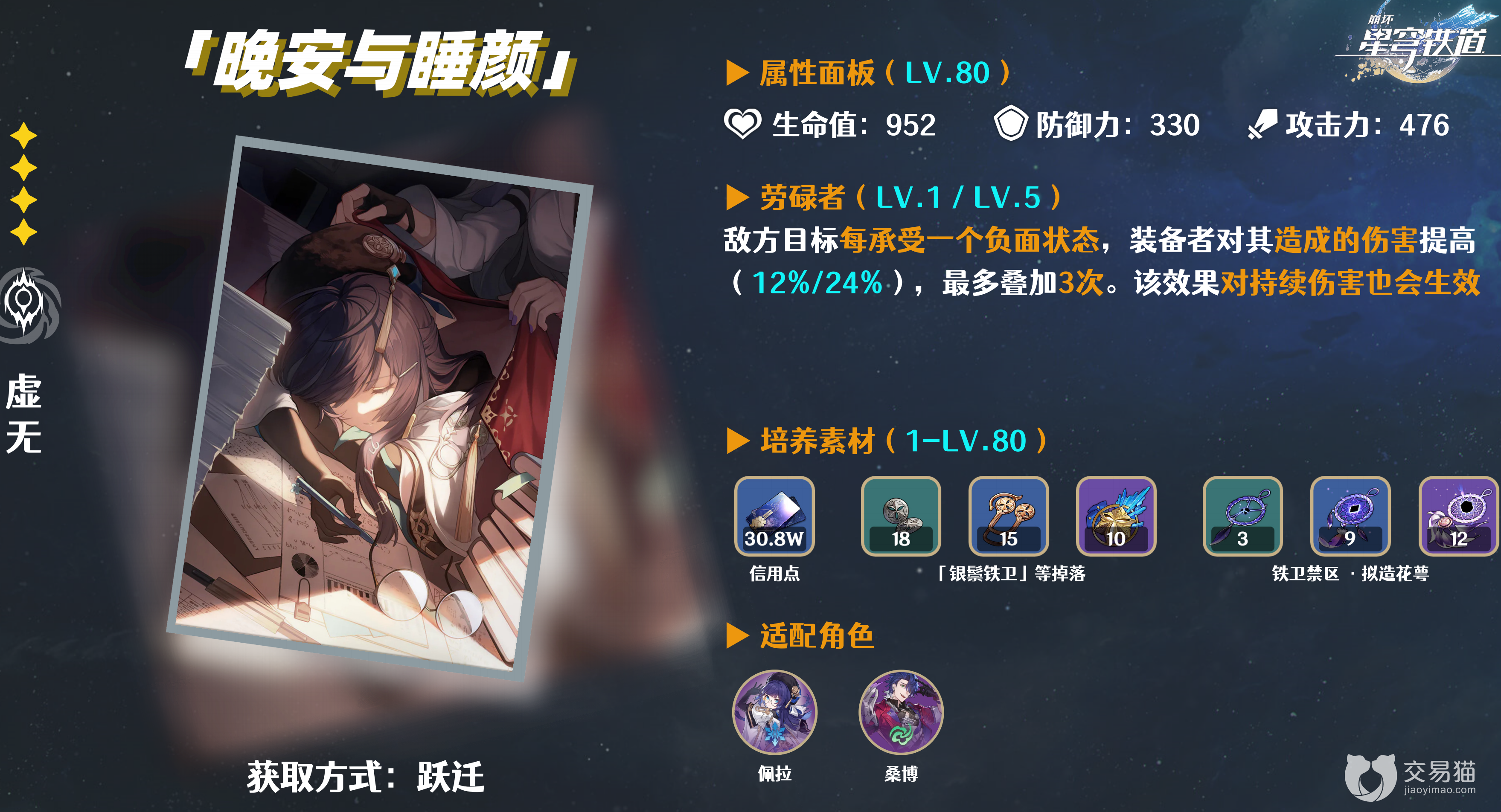 其次就是四星武器——晚安与睡颜,该武器能对负面状态下的敌人造成的伤害更高,跟卡芙卡的天赋比较适配,但是在伤害和属性方面肯定是比专武弱点,所以这个比较推荐给平民玩家。
