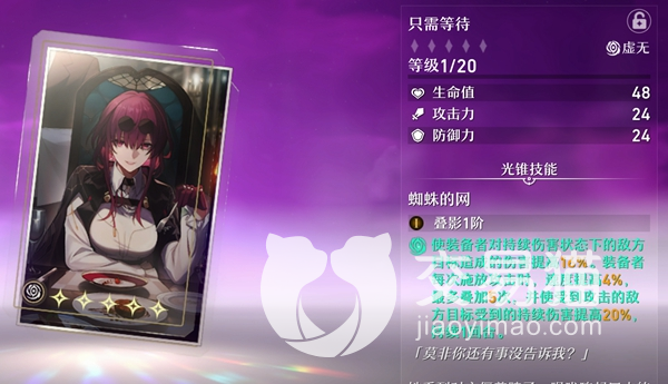 卡芙卡在武器方面的选择肯定优先是专武——只需等待,这个光锥连形象都是该角色的封面,其武器效果十分适配该角色,在装备该武器的时候卡芙卡可以获得持续的攻击速度以及状态加成,这使得她输出能力进一步提升,各项属性也很出色。