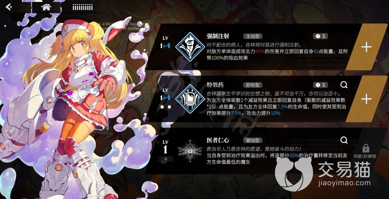 然后是Boss级的安娜和3星杏林,安娜主打回能和降攻,适合一些boss战场合的。有着“医疗卫士”之称的杏林,单攻加回能附带吸血,技能“特效药”群体驱散的效果,并能给自己回能给队友回血。