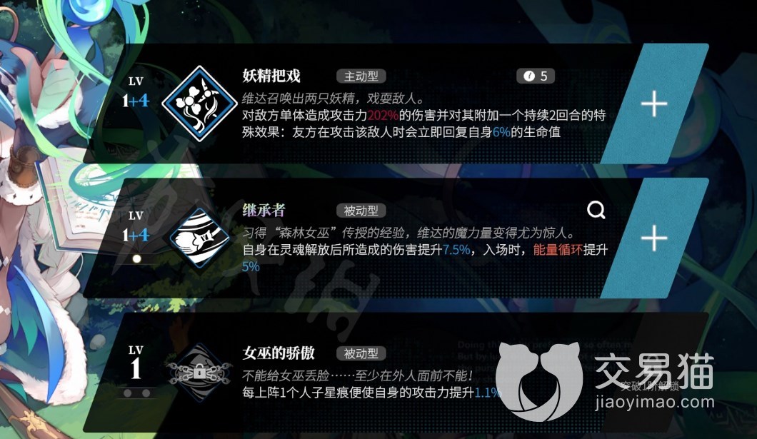 所有的人子星痕据定位大致分为:输出型、弱点型、能量型;我们先来看看输出型的,有5属性的希夕莉和3星的维达。希夕莉有减血和回能以及全体的高伤害加成。维达有单体伤害并且能附加治疗效果,而且还会根据上阵人子星痕的多少来获得攻击力加成,有一定的输出。