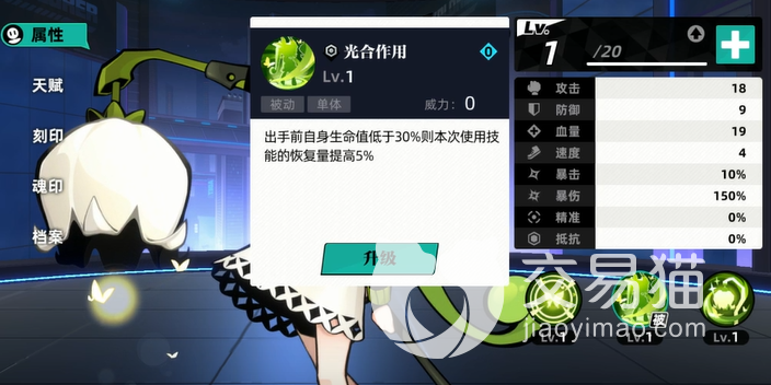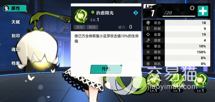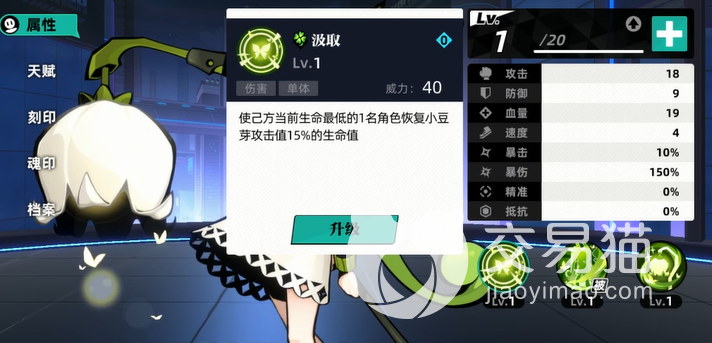 一技能是单体伤害技能,威力只有四十点,使用后可以为残血友军回复一定生命值,回复的具体数值是由小豆芽的攻击力来决定的,恰好她的攻击还算不错,因此回复量也会比较明显。二技能则是个被动技能,在自身血量小于30%时就会提升5%的回复值,换言之就是残血时治疗自己和友军的效率会增强。