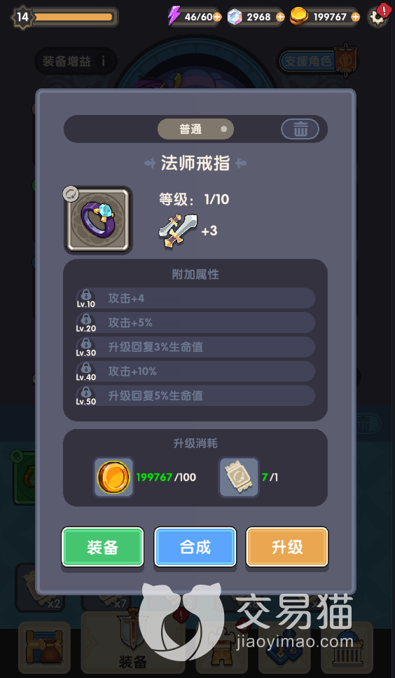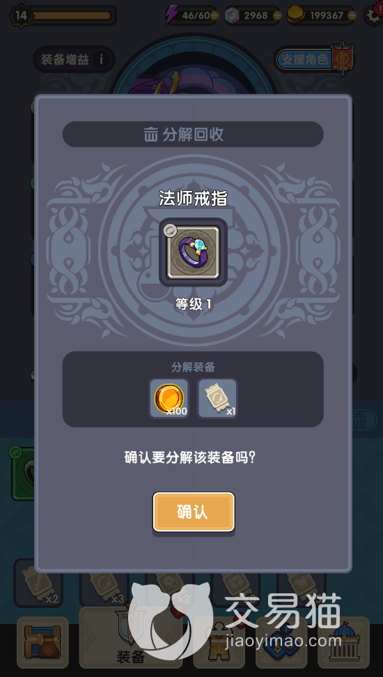 对于空闲的装备可以通过分解或者批量分解的方式变成升级材料,用于后续需要的装备提升使用。比如选择普通品质的法师戒指,可以通过选择垃圾桶的方式分解此装备,可以获得一些金币和戒指升级劵道具。分解成功后,可用于英雄目前戒指装备的提升使用。当升级后,可以提升穿戴此装备英雄的战斗力,当达到一定等级后还可以解锁相应的装备技能加成。